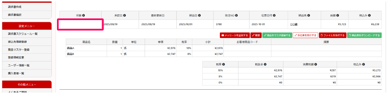 その場合は、納品/請求データの「状態」欄は空白となります。